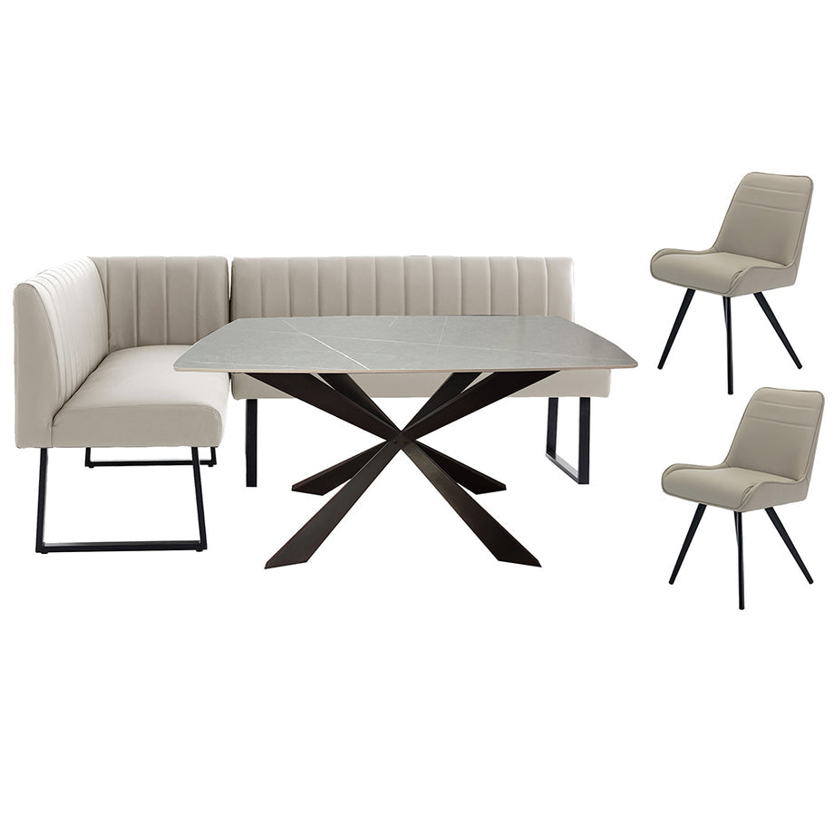 1.4m Grey Dining Table, Corner Bench & 2 Chairs - Taupe