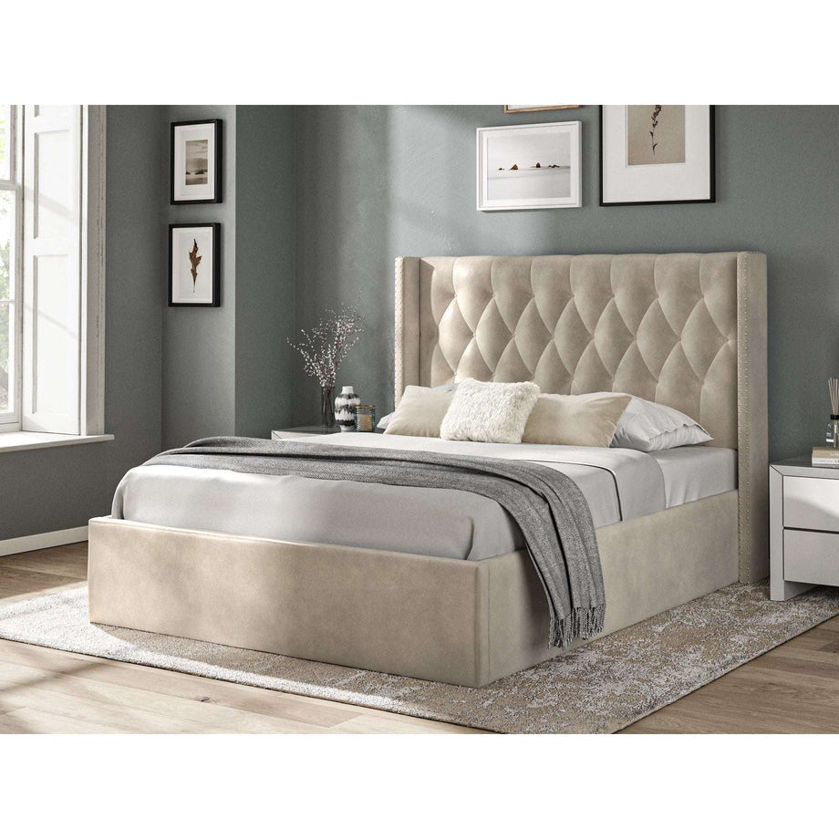 Main Feature | Luxurious Velvet in a pin button panel headboard |