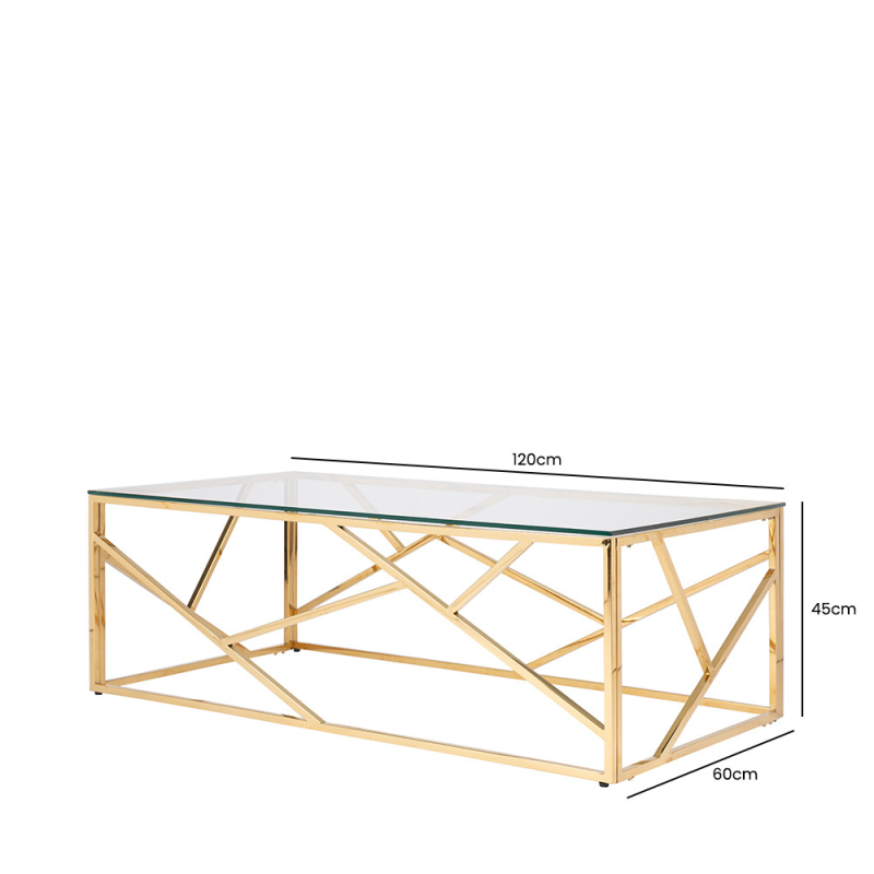 Uniquely crafted metal coffee table for your living room or hallway with gold finished legs and a geometric patterned metal base, a clear tempered glass top. the design which will fit in any decor style. The Zaria coffee table is sure to be a standout piece in any living room