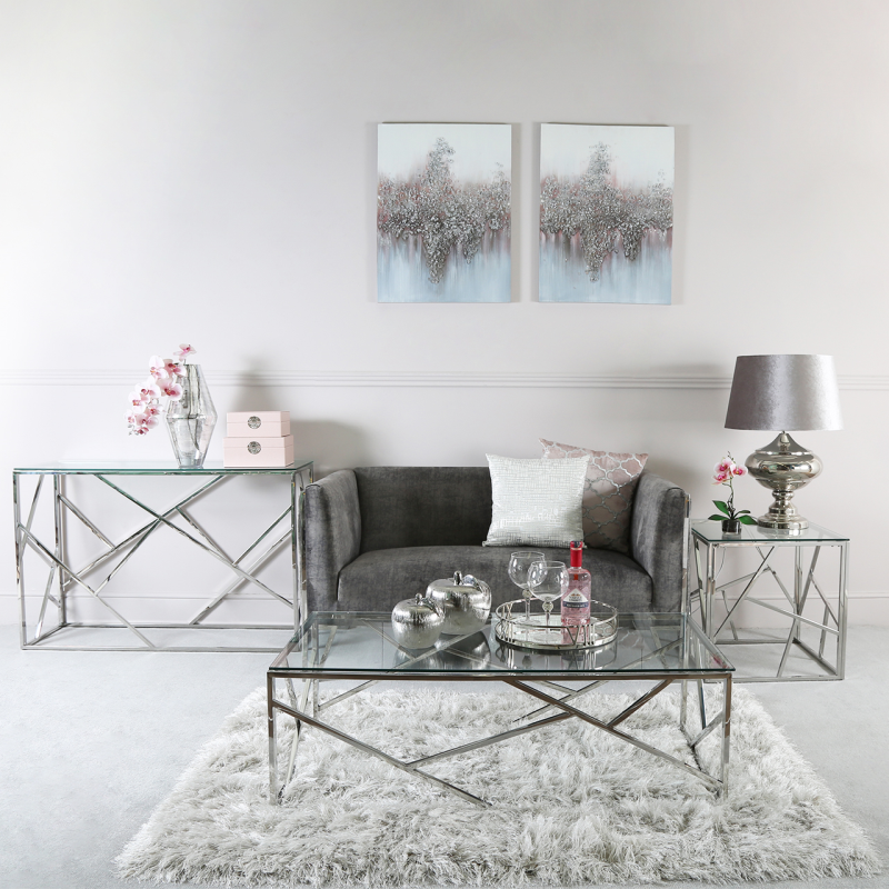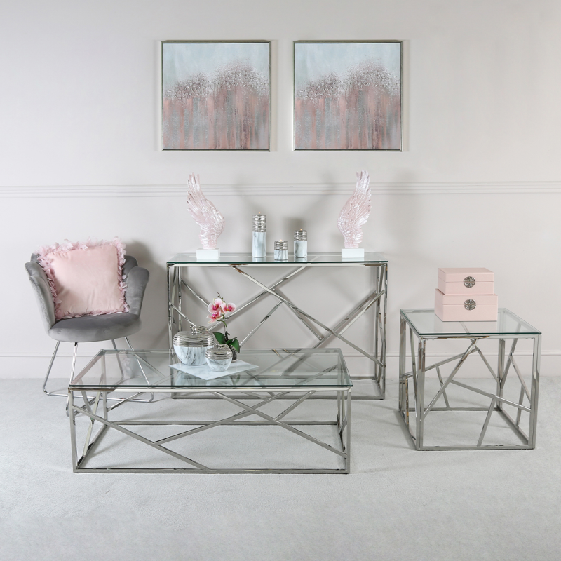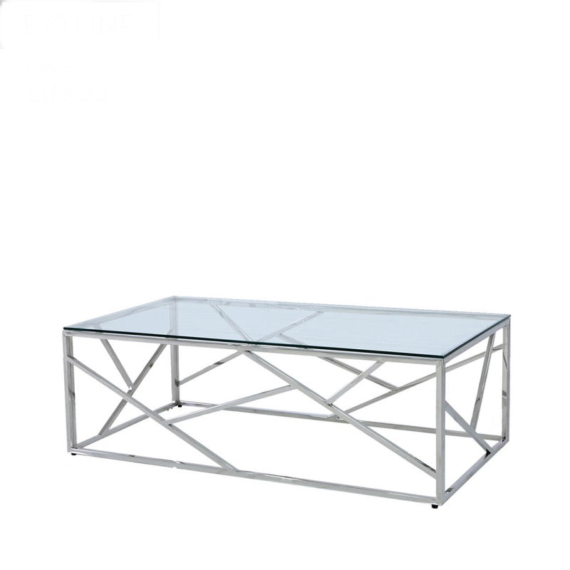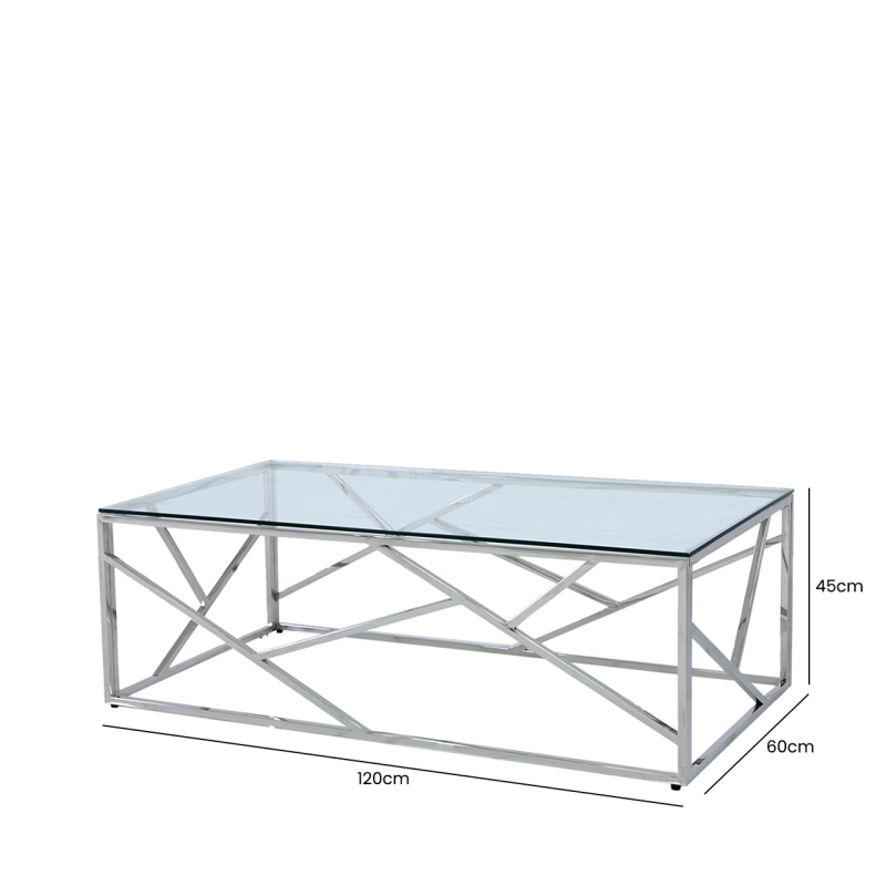 Uniquely crafted metal coffee table for your living room or hallway with stainless steel finished legs and a geometric patterned metal base, a clear tempered glass top. the design which will fit in any decor style. The Azari coffee table is sure to be a standout piece in any living room.