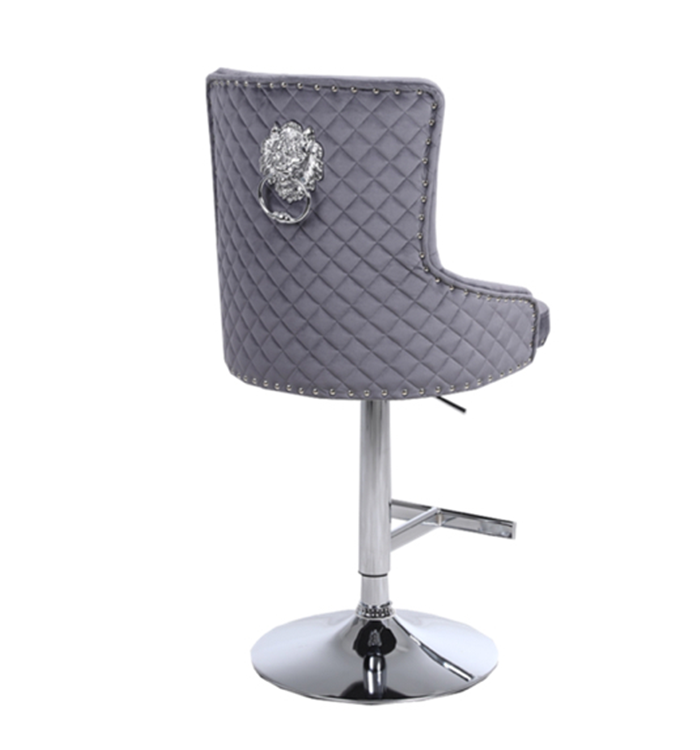 Crafted in soft velvet fabric with a chic quilted design on the back. Thanks to the chrome studded detail around the edge of the chair and the striking lion knocker design, the Bentley bar stool radiates luxury.