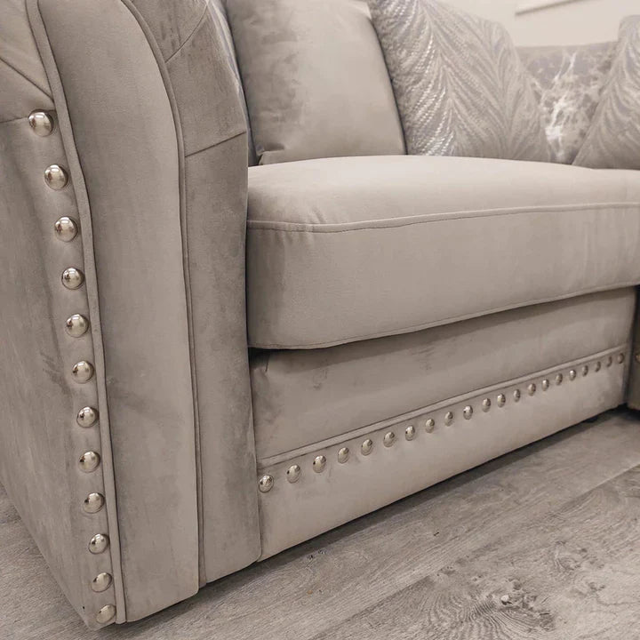 Scatter back 4 Piece Corner Modular Sofa with Large Chrome Stud detail along arm and base. Complete with scroll arm design and features a double sprung unit for extra comfort.