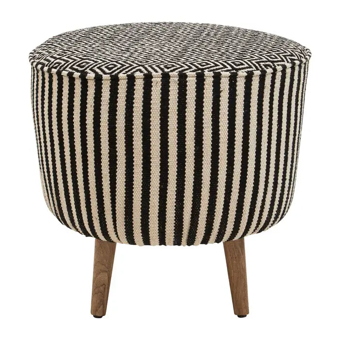 Upholstered in black and white cotton weave, this hand woven footstool with hand woven motifs will suit transitional and eclectic settings. made from mango wood, the flared legs contributes to mid century aesthetic of the design.