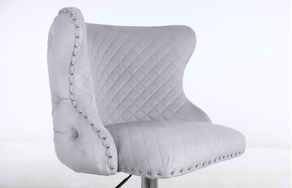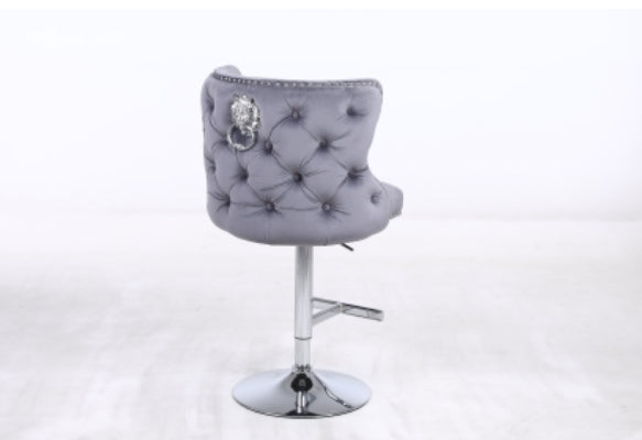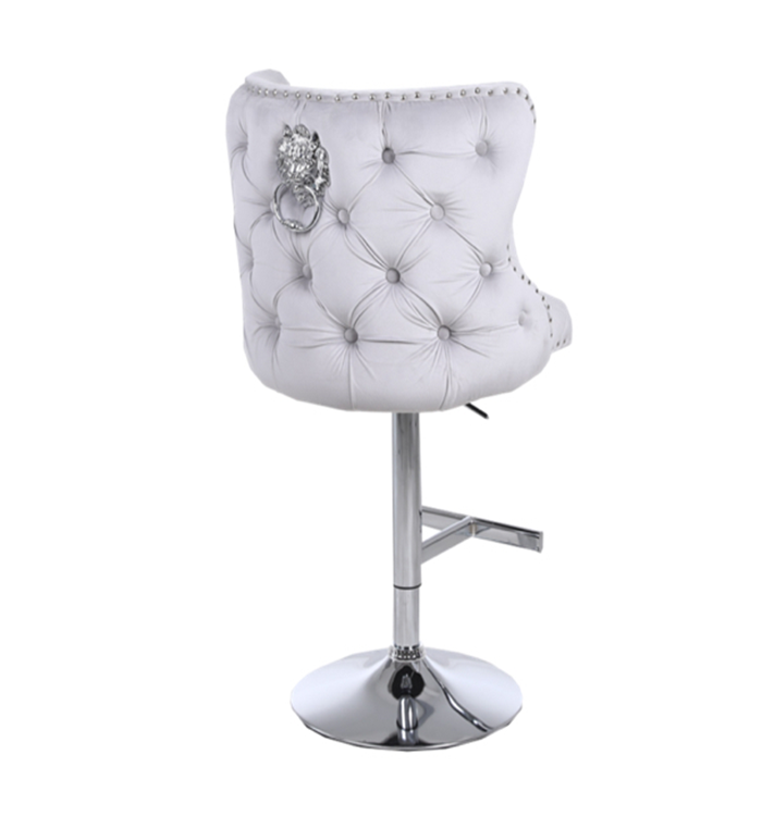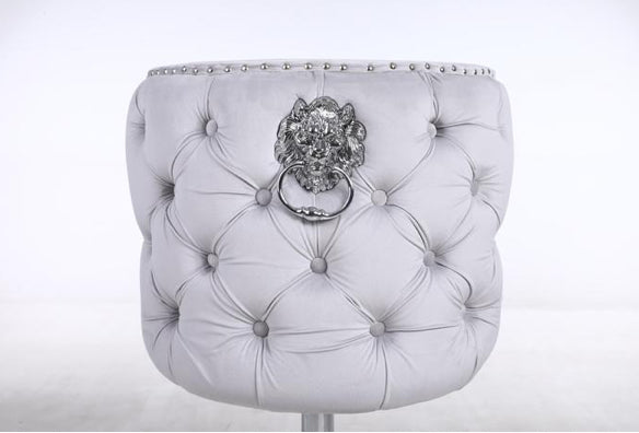 Crafted in soft velvet fabric with a chic quilted design on the front. Thanks to the button back, chrome studded detail around the edge of the chair and the stylish lion knocker design, the Chelsea bar stool radiates luxury.