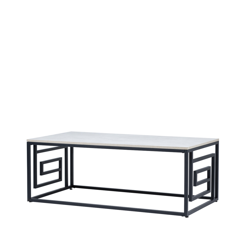 Add a crisp, modern feel to any living area with the Devi coffee table. It features a black metal frame with Grecian inspired design on the side panels, with grey wooden, faux concrete finish top.