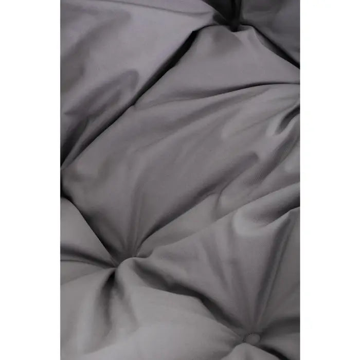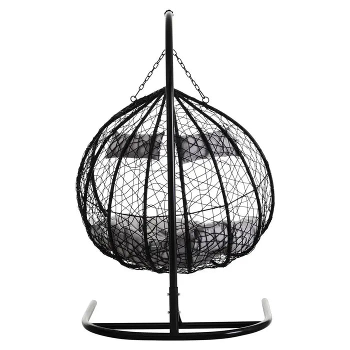 This double hanging chair has a wide seat that is crafted from black rattan effect and is furnished with dense foam filled grey cushions. The black metal frame complements the texture of the seat and offers stability