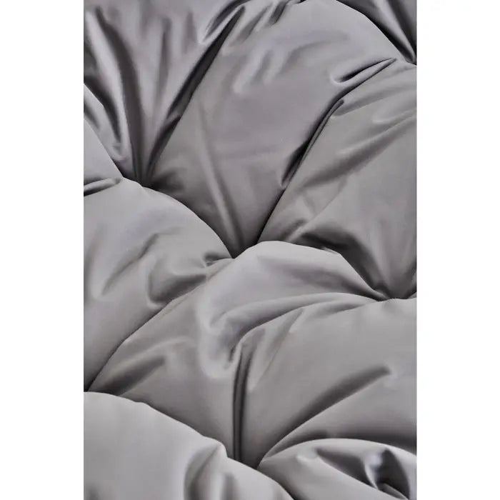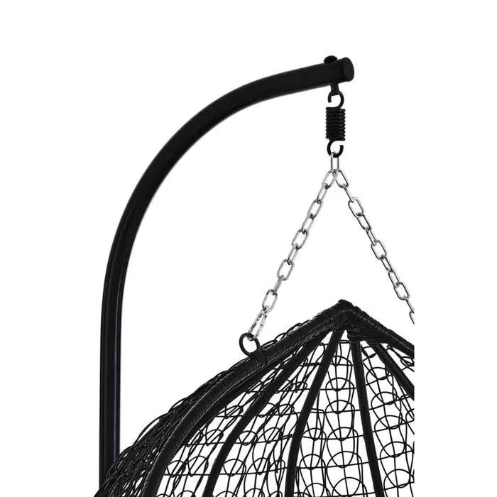 This double hanging chair has a wide seat that is crafted from black rattan effect and is furnished with dense foam filled grey cushions. The black metal frame complements the texture of the seat and offers stability with its round base.