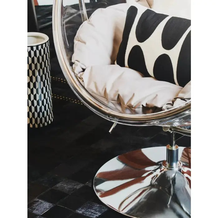 The stainless steel frame supports the clear seat of this hanging chair. The transparent seat has grey cushions in dense foam padding which add to the comfort, while the rounded base of the contemporary frame adds stability to the floating design.