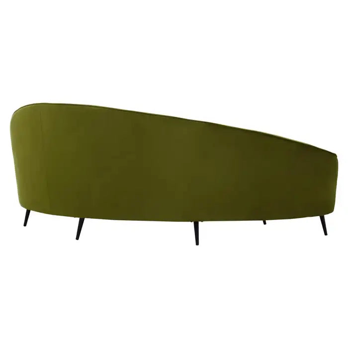 This three seat sofa boasts a sculptural form with an olive velvet upholstery. The thick foam padding ensures comfortable seating and the matte black metal legs provide firm support whilst enhancing style