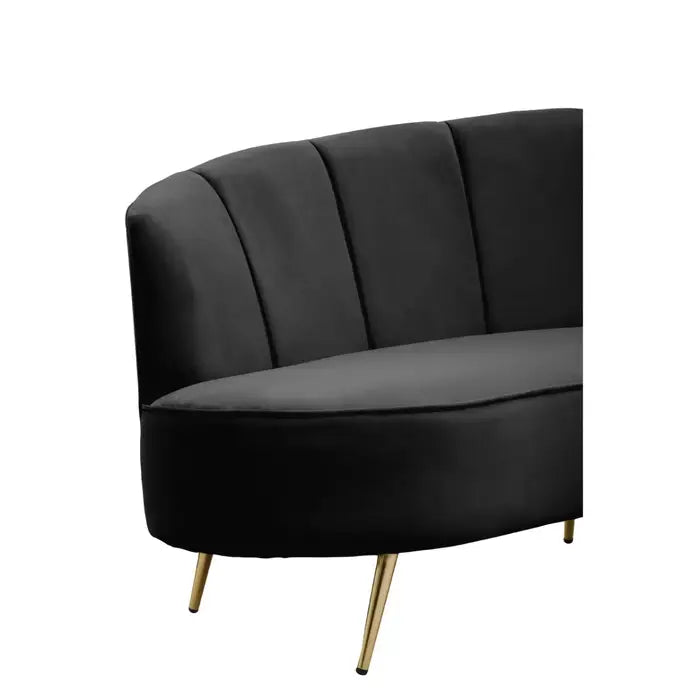 The Hanna sofa is upholstered in black velvet having a clean line stitching with a pleated effect on the back. Elevated by slanted metal legs in gold finish, the curved shape of this sofa makes a luxe statement in the living area.