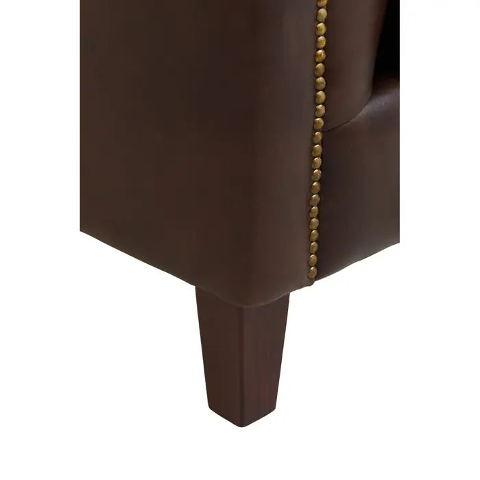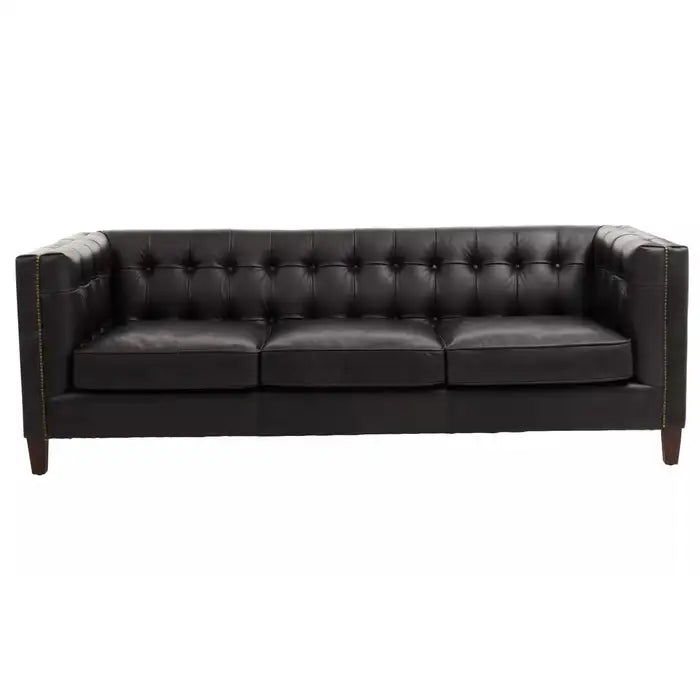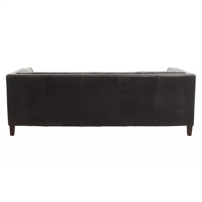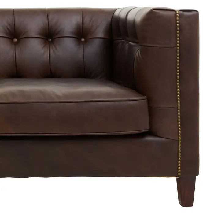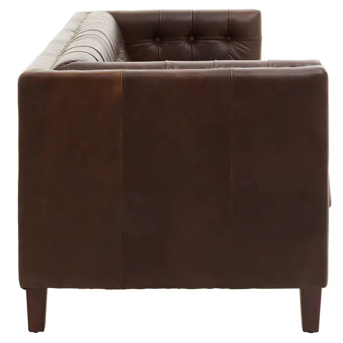 This three seater sofa in dark brown colour features genuine leather upholstery and oak wood legs that exude elegance. The button tufted back creates a vintage aesthetic while the minimal trim along the arms and back enhances sophistication