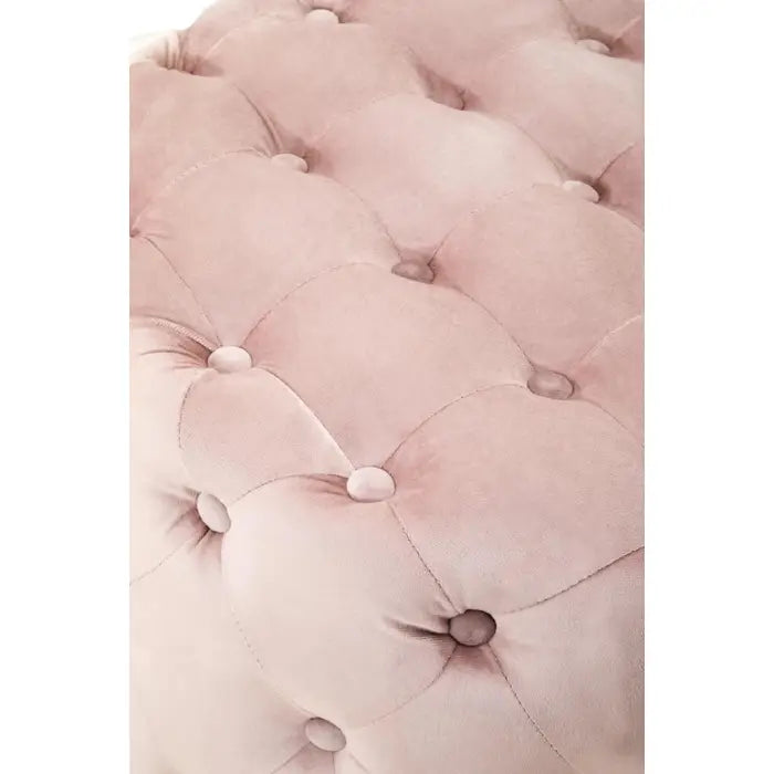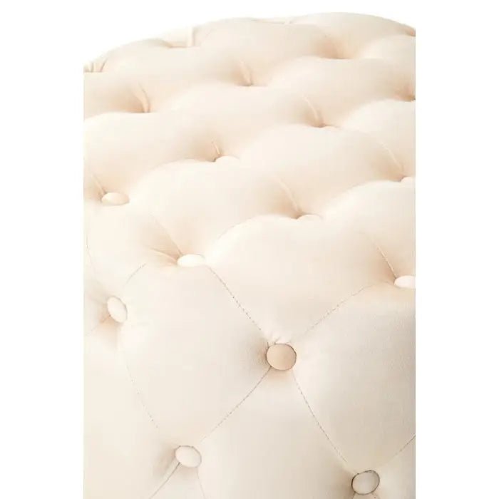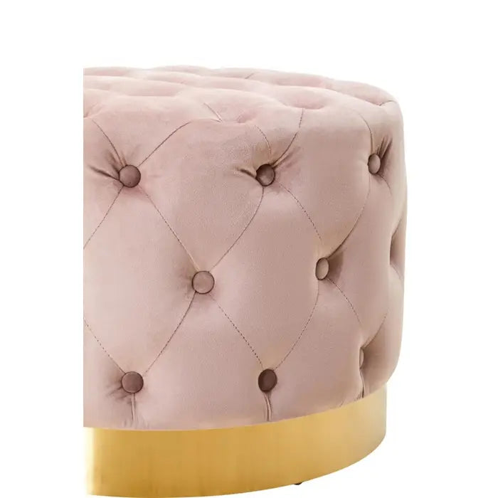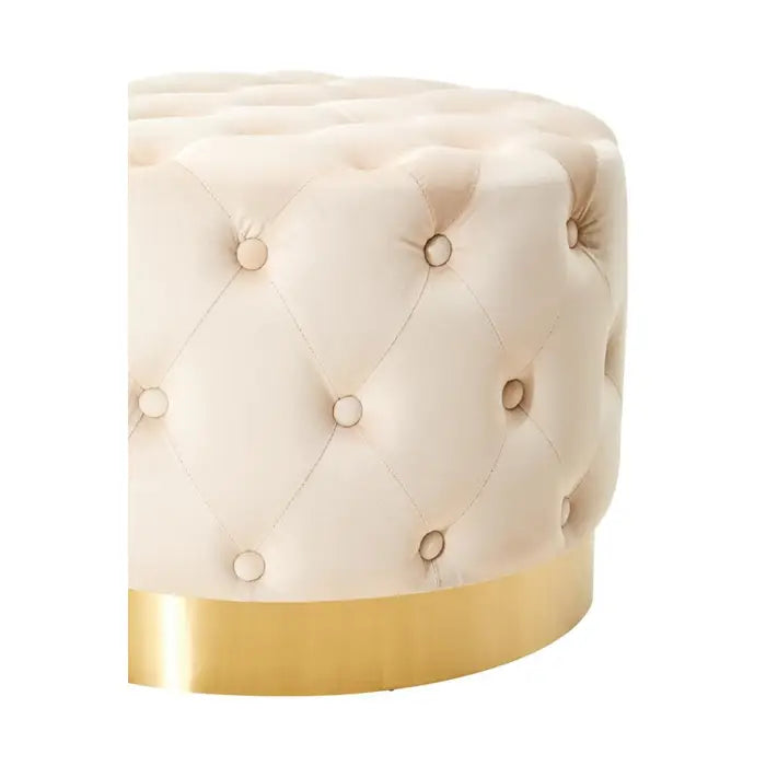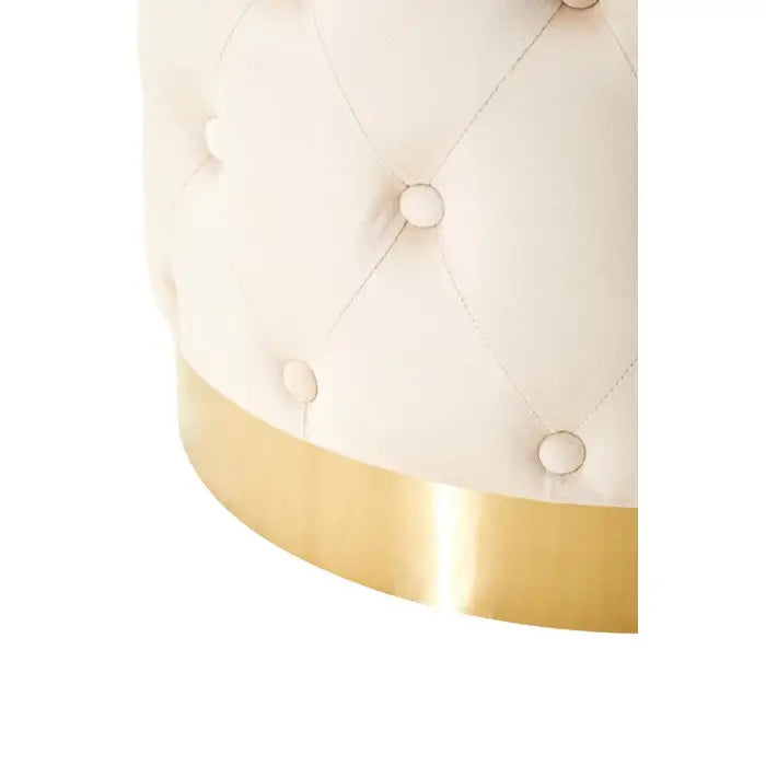 This stool features button tufted plush velvet upholstery suitable for luxury decors. The sleek matte gold finish metal base contrasts elegantly with the stone velvet, making the stool an opulent accent piece.