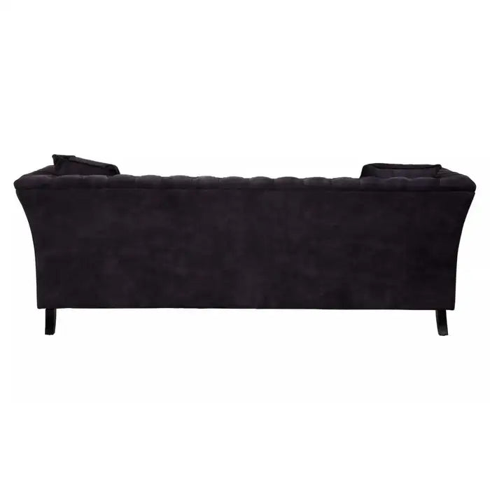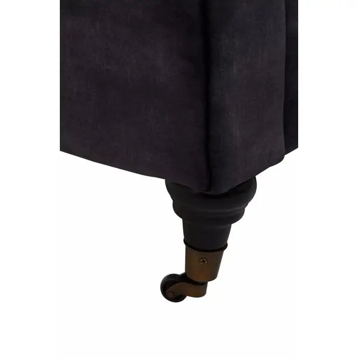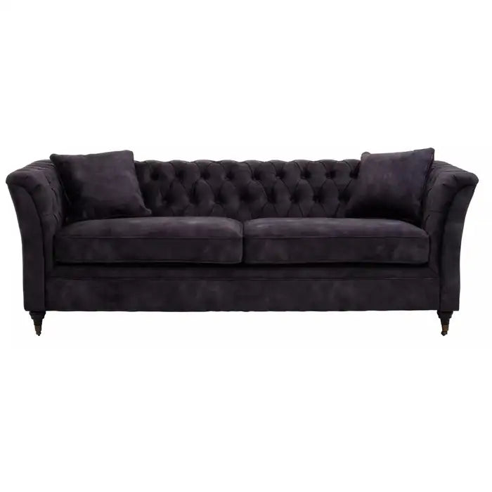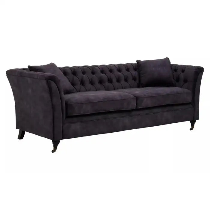 this three seat dark grey velvet sofa features a classic chesterfield design with a modern flair.