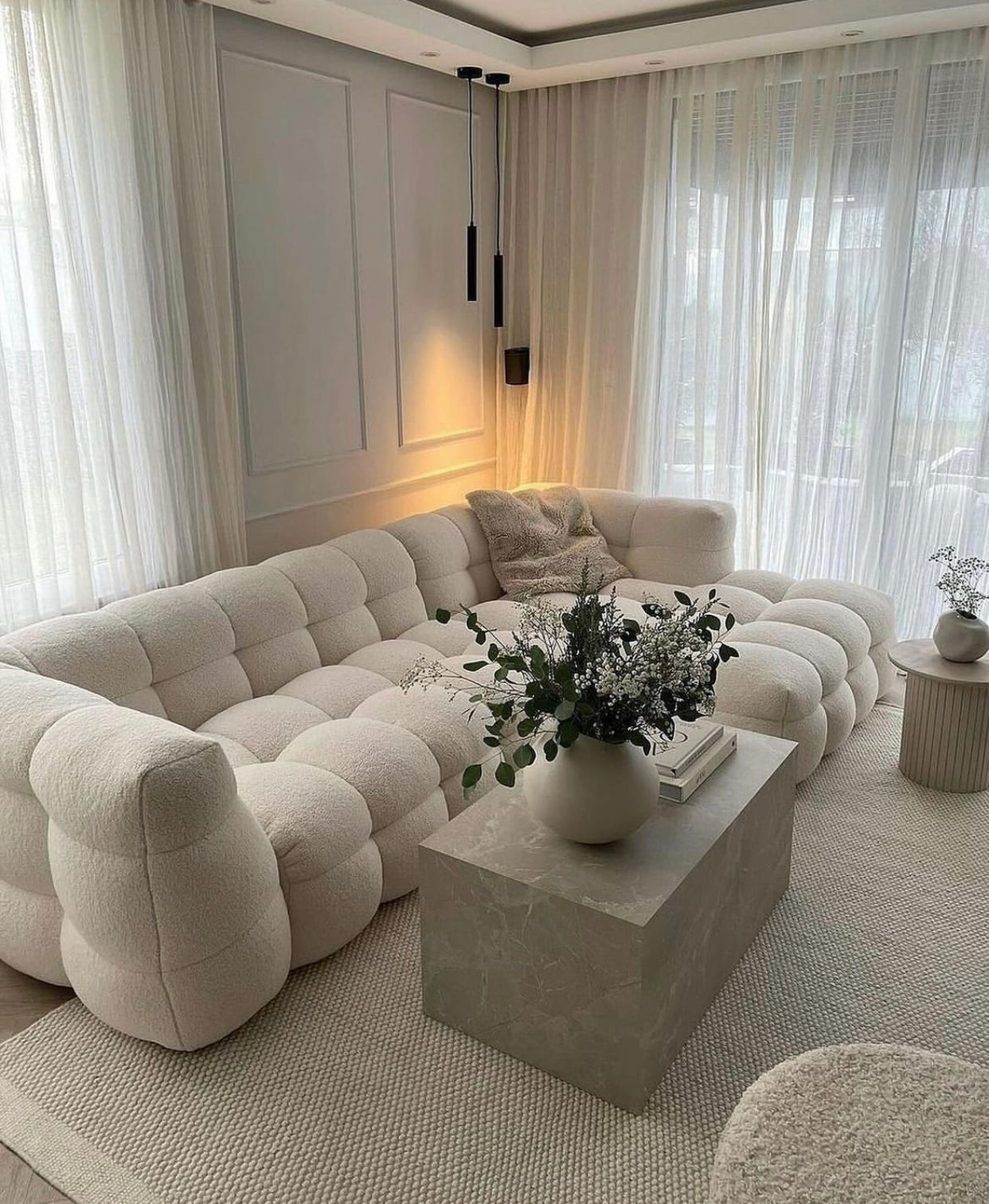 The super-elegant bouclé Ivory fabric creates an on-trend look that styles perfectly in both minimalistic and modern schemes.