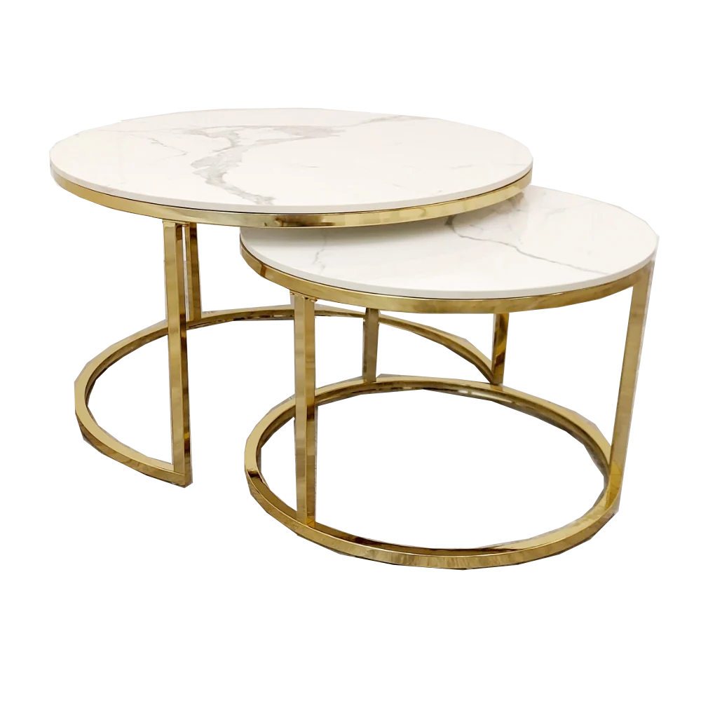 This beautiful 2 piece nest table set features Polar White sintered stone tops placed on simple round gold frames.