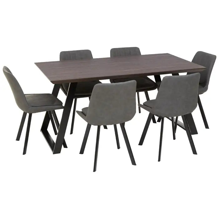 The 7pc Westward dining set boasts a modern nordic style featuring a rectangular top and a sledge base, and the grey leather effect chairs create a sophisticated statement. Ideal to pair with the Nordic themed interior, this set offers a standout dining experience.